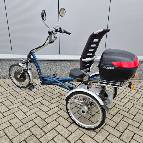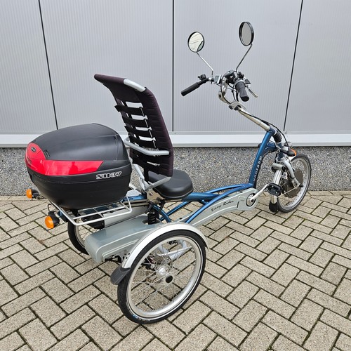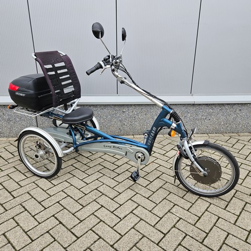 Gebruikte elektrische Van Raam Easy Rider 2 uit 2015 met 5413km. Stabiele en comfortabele driewielfiets met stoeltje. Je trapt met de benen vooruit en kunt altijd met de voeten aan de grond. Voorzien van 8 versnellingen, handremmen, richtingaanwijzers, grote koffer achter, 2 spiegels en grote 24.8Ah accu. (Getest op 84%) Actieradius ca 60 – 70 km.