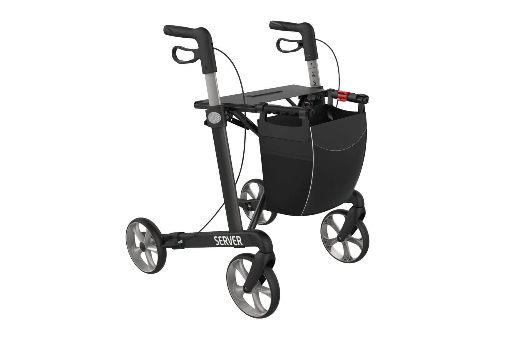 De Server is eenvoudig in te klappen en blijft gesloten door het eenvoudige vergrendelingssysteem welke tevens dient als ergonomisch gevormd handvat waarmee de rollator opgepakt kan worden.